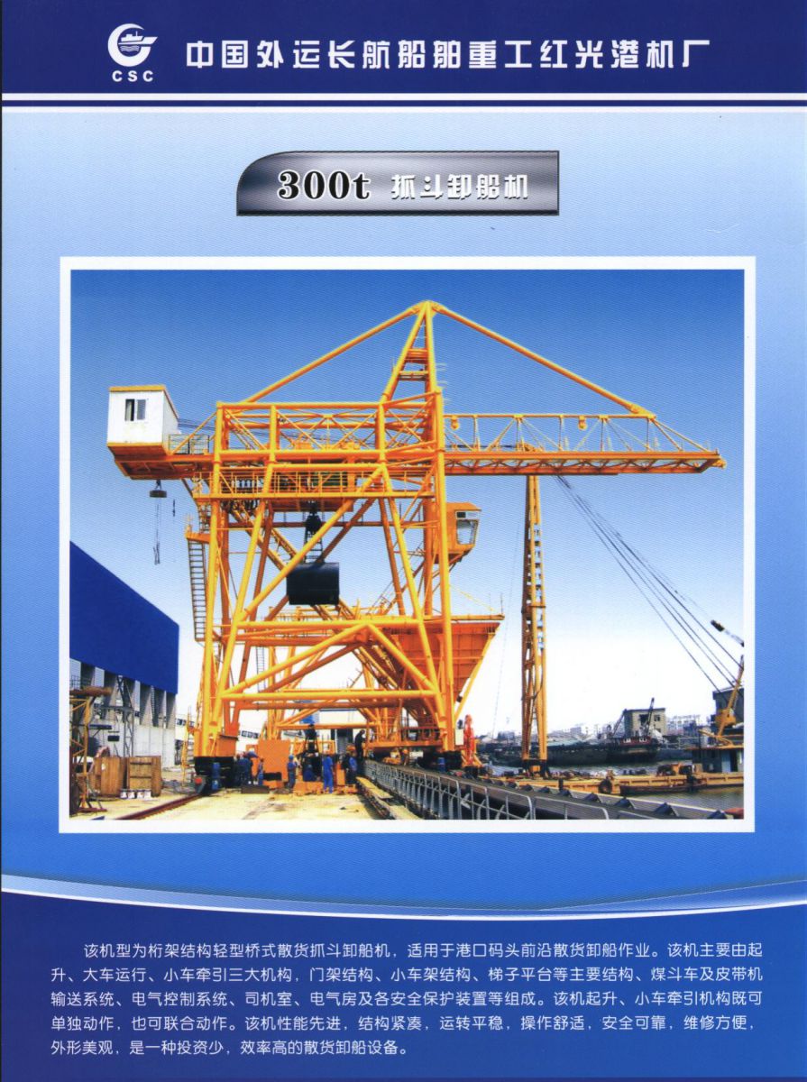 The machine has the following functions: the grab enters the cabin - the grab is closed to dig materials - the grab is lifted out of the hatch - the trolley runs over the hopper set in the span of the ship unloader and then the grab is opened to discharge materials - the materials fall into the hopper, pass through the vibrating feeder at the lower part of the hopper, and then pass through the belt conveyor inside the machine to the wharf along the elevated belt conveyor. The whole process can be operated manually or semi-automatically. The environmental protection mode of the machine is: the surface water is supplied to the water tank on the machine, and then the water is supplied to each spray point by the water pump. The crane running mechanism of the whole machine can walk along the riverside track, and can arbitrarily change the operation position parallel to the riverside. After the operation, lift the front girder to a fixed position, and set a safety hook to hook the front girder. This machine also has the function of lifting the cabin cleaning machinery from the wharf into the operation cabin without unloading the grab.