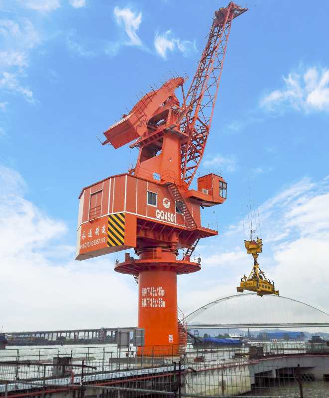 GQ4535固定式港口网投十大官网用于港口、中小型码头,亦可用于库场,堆栈或厂区内,进行件杂货或散货装卸作业。固定式吊机为单臂架式,钢丝绳变幅,采用复滑轮补偿,货物可作水平位移,因此可全幅度带载变幅,作业效率高。旋转支承采用单排滚珠座圈,可作360。全旋转,运转平稳,使用可靠。